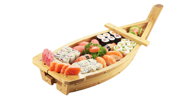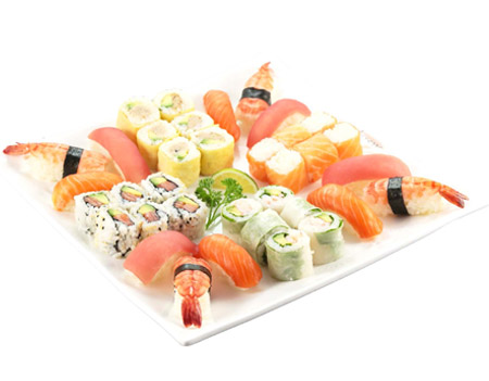 + 6 california (saumon avocat), 6 printemps (crevette avocat menthe coriandre),+ 6 saumon rolls (cheese), + 6 egg rolls (thon cuit avocat), + 4 sushi saumon, + 4 sushi thon, + 4 sushi crevette, + 8 brochettes (2 boulettes poulet, 2 poulets, 2 bœufs fromage, 2 bœufs)