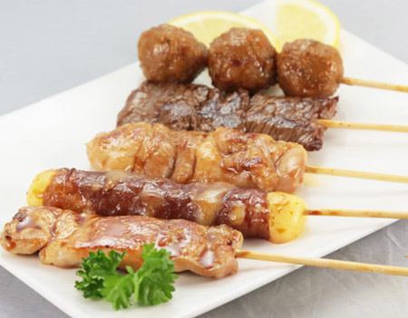 5 brochettes (2 poulets, 1 boulette poulet, 1 bœuf fromage, 1 bœuf)