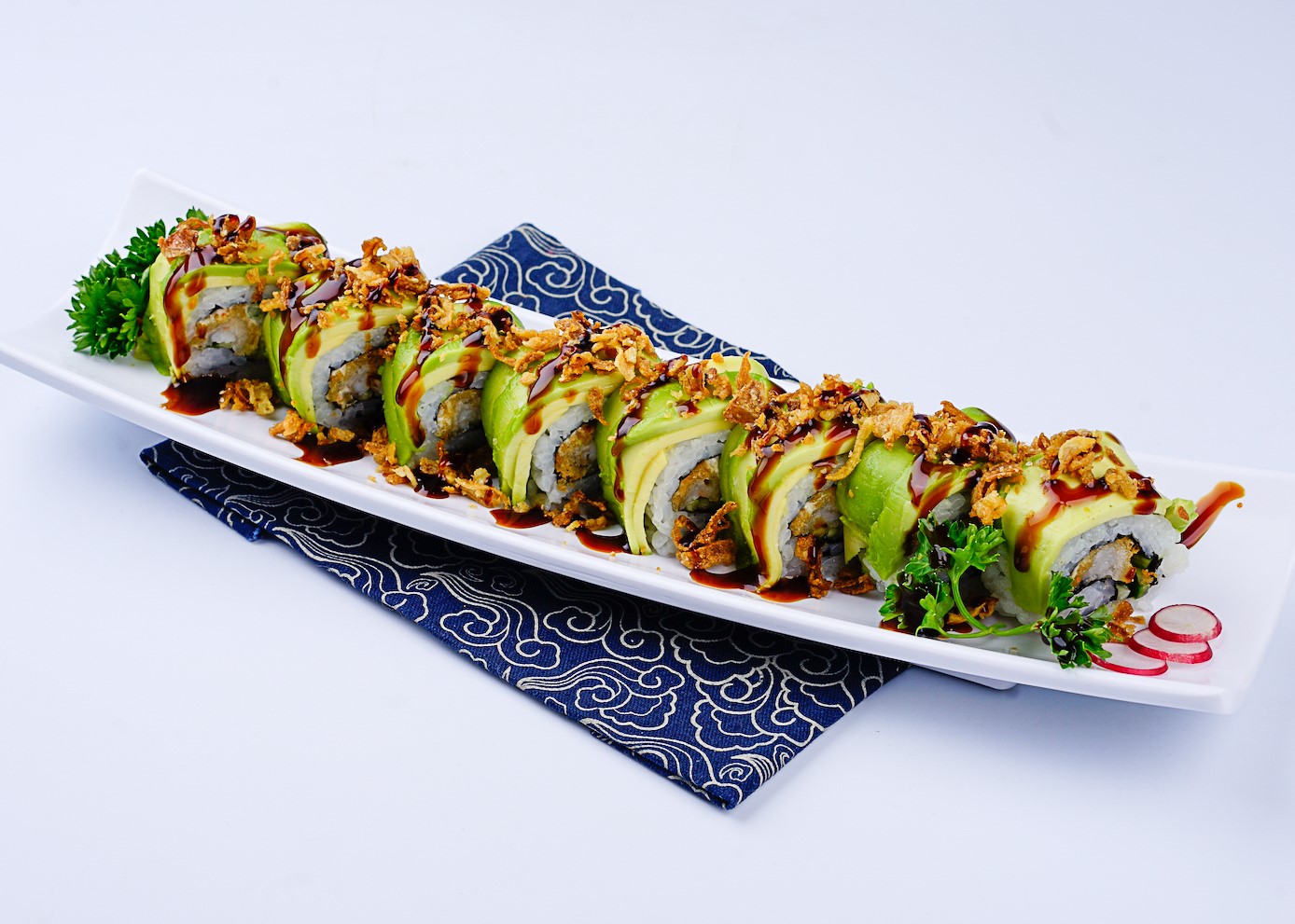 Extérieur : Avocat, oignons fritsIntérieur : Crevette tempura, concombre spicy