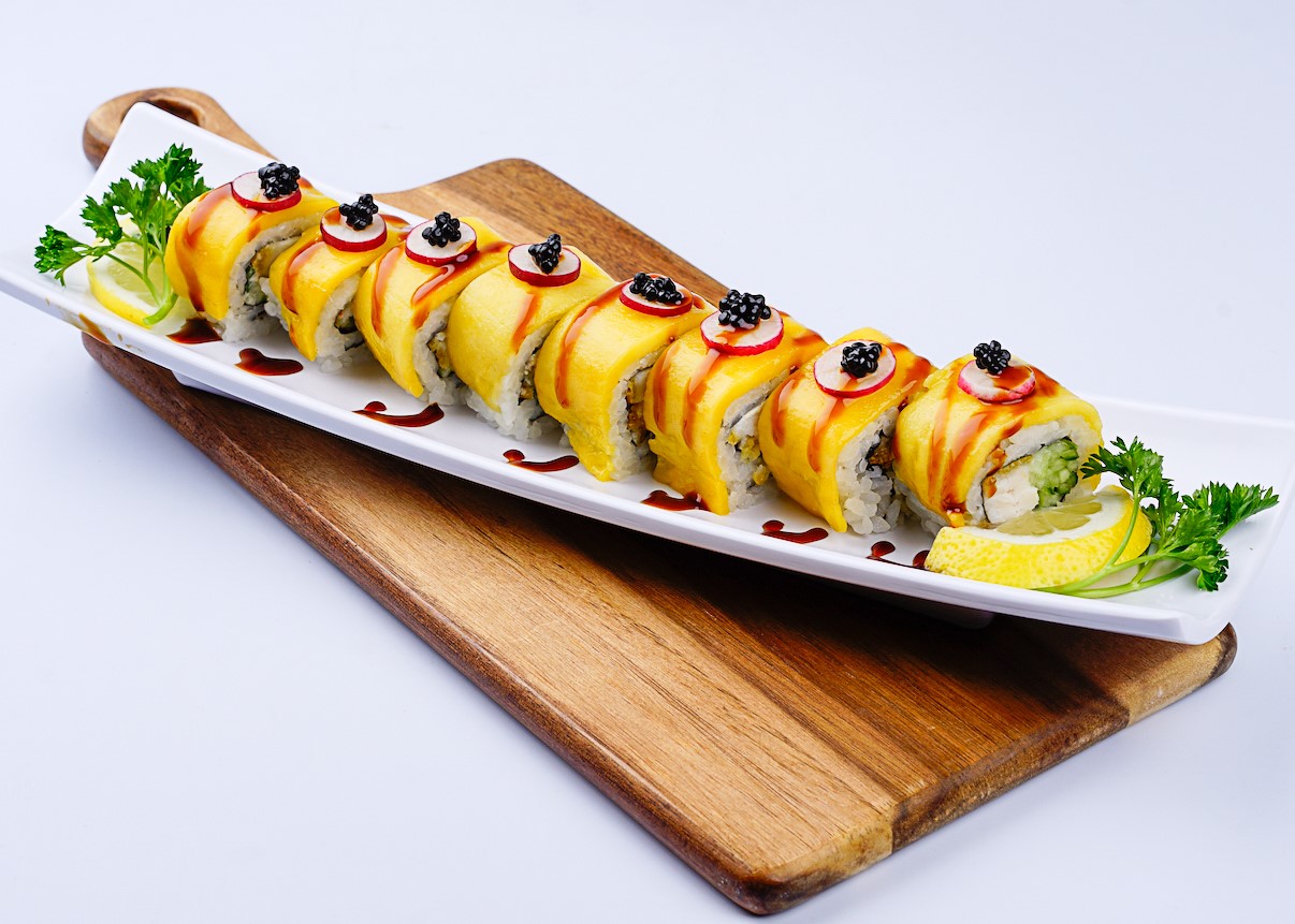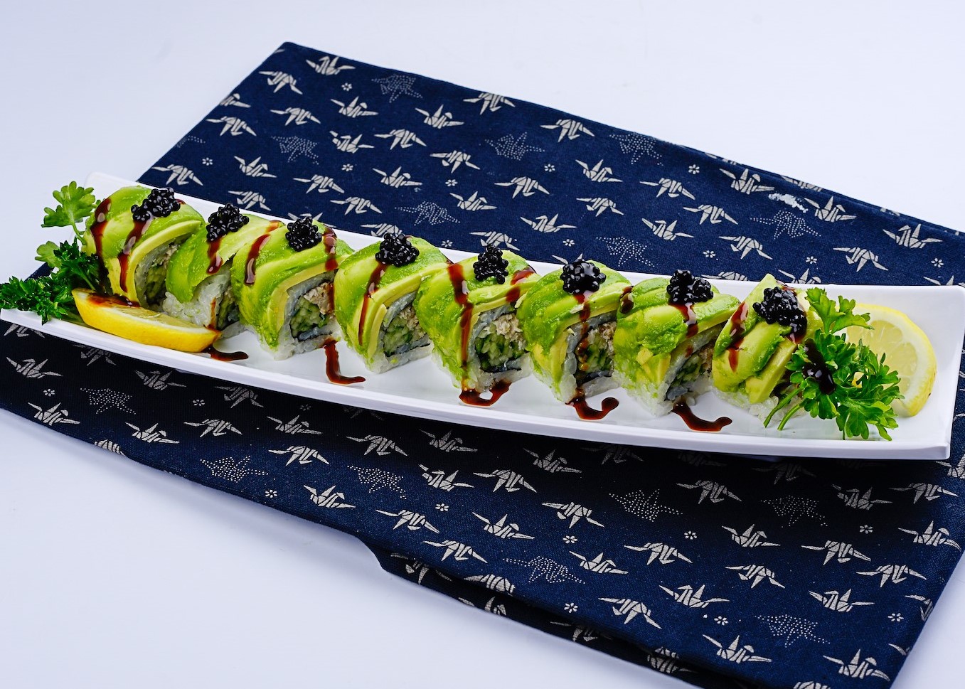 Extérieur : Avocat, œufs de poissonIntérieur : Chair de crabe, concombre spicy
